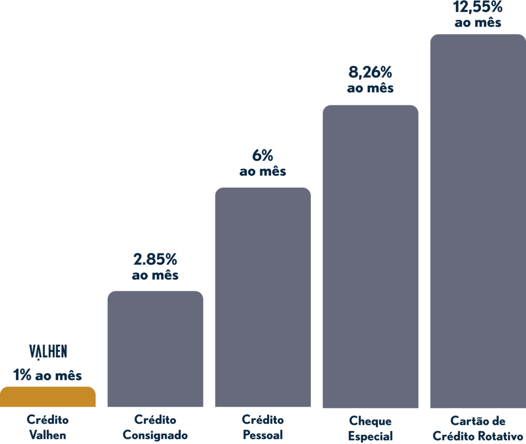 Nunca solicitamos pagamentos antecipados ou mediante boletos em nome da Valhen Bank. Nossa taxa de juros começa em 0,99% ao mês + IPCA, e todos os custos são apresentados de forma clara no momento da proposta.